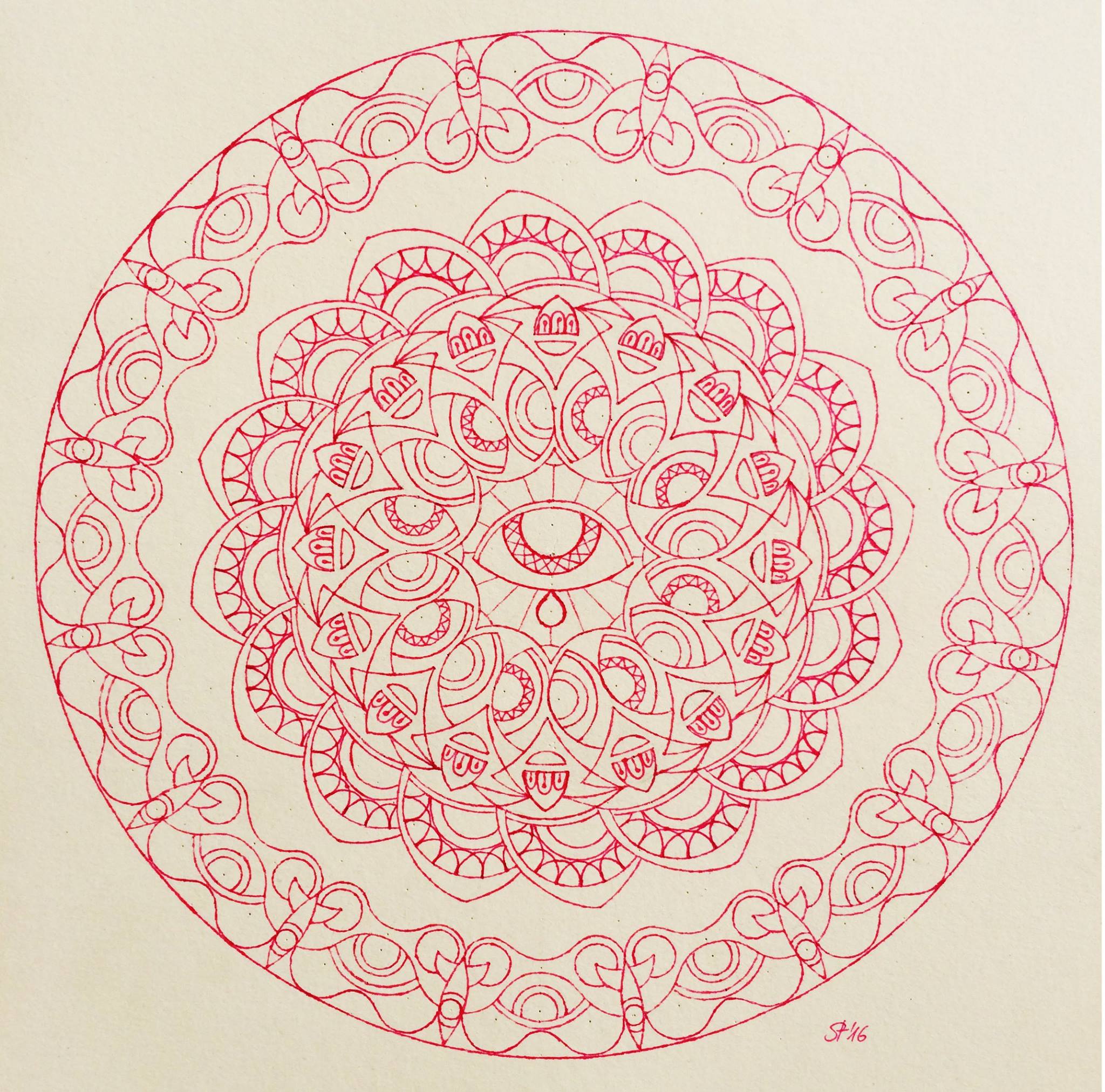Tine Steiss drew this mandala in November 2016 with happiness.com already in her mind, months before we started working on it. The mandala is hand-drawn, only with the help of a compass, a pencil and an eraser, and took me about five hours to finish. I hope you enjoy coloring it in!