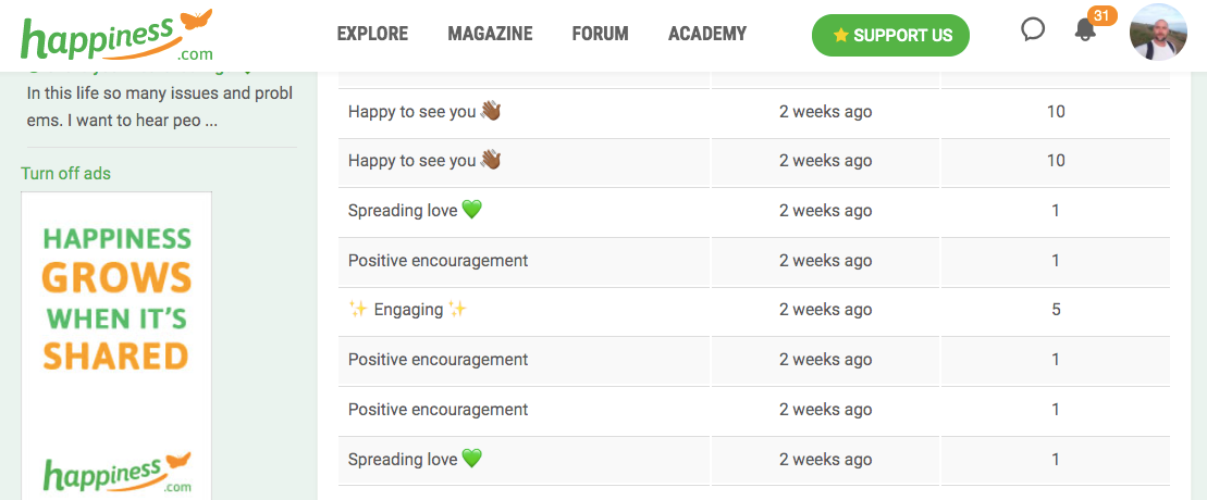 While simply logging into the website each day can earn you KARMA points, you can gain more by being motivated, spreading kindness, and encouraging others to do the same. This could be by sending messages to other members, having meaningful conversations in the Forum, creating an Event, or sharing a happiness Magazine article through your social media account.
